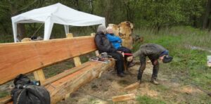Met vereende krachten manoeuvreren we de massieve planken van de aanhanger naar de bouwplaats aan de bosrand. Ronald Vrijenhoef heeft uit de stammen van Lariksbomen, die tijdens een dunning van bomen in de bosrand waren geveld, zitting, rugleuning en voetenbank gemaakt. De staanders zijn gemaakt van Robiniahout. Ter plaatse worden de massieve onderdelen tot een monumentale bank gemonteerd en stevig in de grond verankerd. Het nieuwe rustpunt is via een paadje bereikbaar vanaf het druk belopen wandelpad. Kijk voor meer monumentaal houtwerk van Ronald op www.vrijinhout.nl.