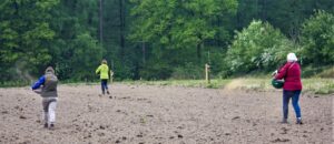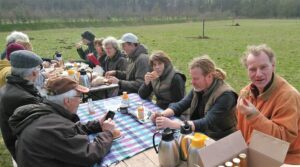 In de rijen met walnotenbomen planten we struiken van amandel (20 stuks van het ras Robijn) en hazelnoot (25 stuks van diverse rassen). Het zal wel even duren voordat we de eerste noten gaan oogsten. We denken dat de bomen en struiken ook een positieve invloed hebben op de productiviteit van de akkergewassen. Op alle akkerstroken is in november het wintergraan spelt gezaaid. Vandaag zaaien we daar met de hand een mengsel van akkerkruiden overheen. In de pauze eten we heerlijke broodjes die zijn gebakken met ons eigen rode-emmermeel door huisbakker Sander. Er is ook kastanje-chocoladetaart gebakken door Arno.
