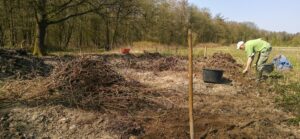 We hebben een begin gemaakt met de uitvoering van ons voorbeeldproject voor natuurlijke kringlooplandbouw. In het bosje, grenzend aan het zuidelijke perceel, halen we de Japanse Duizendknoop weg.