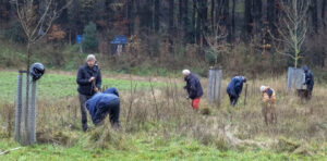 Met tien werkgroepleden planten we 110 struikjes; bessen, hazelnoten en peerlijsterbes. Het positieve van de regendag is, dat we geen water hoeven geven. Deze plantactie is de afsluiting van de herinrichting van het landbouwgebied. Er is nu een kleinschalige afwisseling van bloemrijk grasland, kruidenrijke akkerstroken en rijen met fruit- en notenbomen en -struiken. Er is een diversiteit aan teelten en een diversiteit aan vegetatiestructuur.