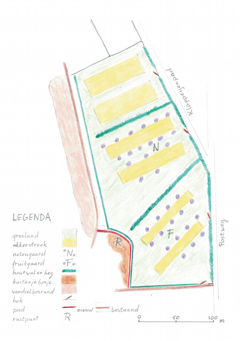 Het gebied bestaat uit grasland met daarin zes akkerstroken, geflankeerd door rijen struiken, hoogstamfruit- en notenbomen. Tussen de bomen en struiken in worden kruiden en groenten verbouwd.